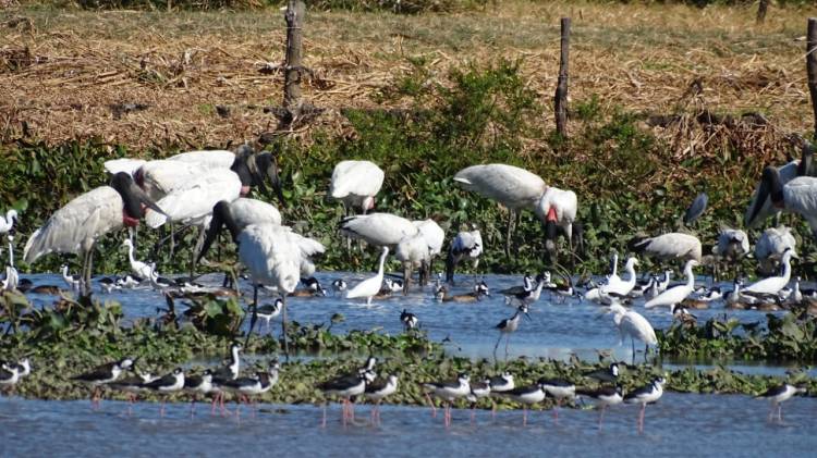 Esta ave, se caracteriza por presentar un cuello rojo intenso, fácilmente distinguible a la distancia. Su alimentación se basa en la búsqueda de anguilas de barro, por lo que es muy común de observar caminando sigilosamente en las áreas inundadas. Un rasgo que llamó nuestra atención durante nuestra pajareada, fue observar algunos jabirú con un copete blancuzco en la cabeza, característico en los juveniles. Además, es común observarlos junto a otras especies de aves, que comparten el mismo espejo de agua.