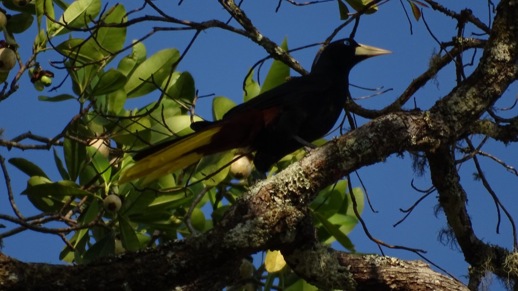 Comenzando nuestra escalada, notamos cambios abruptos en la composición de las aves del bosque, apareciendo cada vez más especies de tierras altas, como el Tucán Esmeralda (Northern Emerald-Toucanet), el Jilguero (Black-faced Solitare) y en el punto más alto nos encontramos con la especial Tangara Bermeja (Hepatic Tanager). Con un buen número en nuestro checklist, decidimos regresar hacia la casona, sin antes toparnos con una hermosa Caciquita (Elegant Euphonia), que significaba el ave 117 de la lista y el final de la pajareada en nuestra ruta.