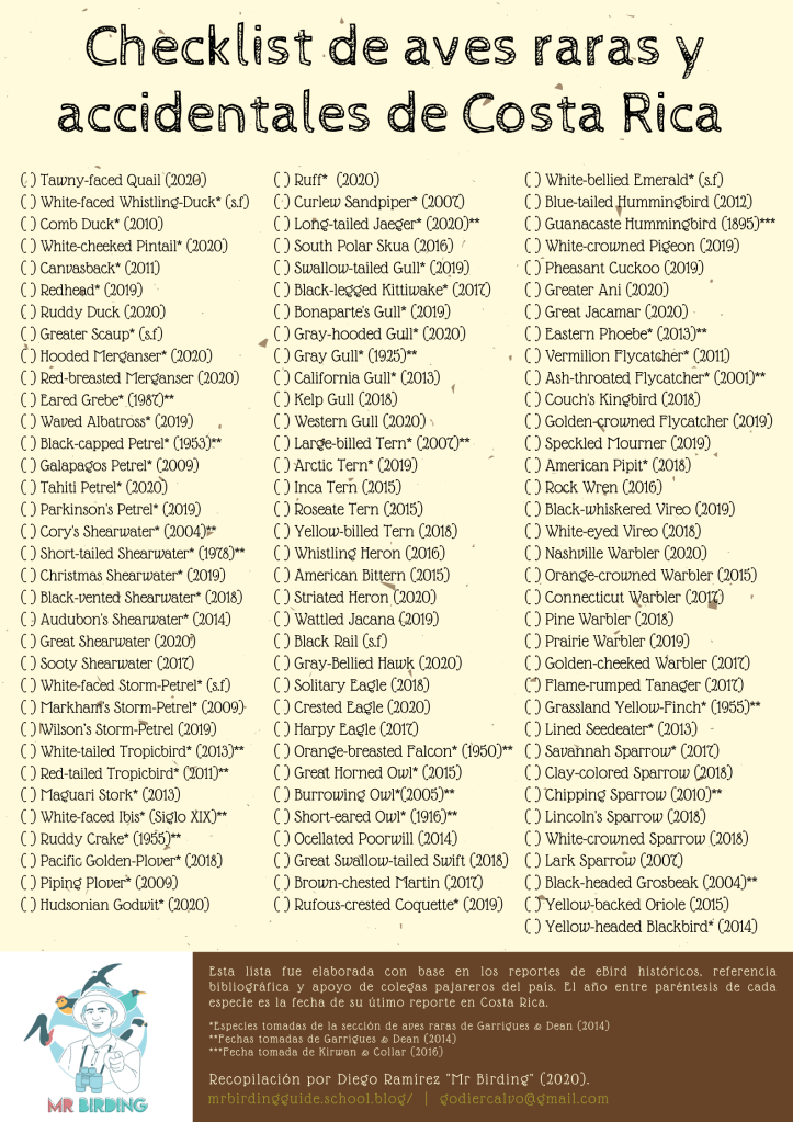 Espero que este pequeño resumen sobre las aves más raras de observar en Costa Rica haya despertado en tu corazón aventurero las ganas de salir a explorar los bosques en busca de estos fantasmas. Son muchas las aves difíciles de encontrar en el país, por ello te invito a descargar el checklist con las especies que pueden significar todo un desafío de documentar en el territorio continental y marítimo costarricense. Este listado se realizó con base en registros de la plataforma eBird, anécdotas de pajareros, la sección de aves raras de la guía de aves de Costa Rica¹ y la gran ayuda de mis amigos Marlon Varela y David Segura.