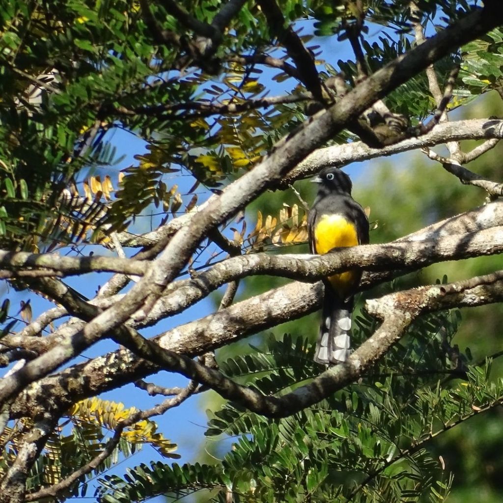 Para cuando llegamos a la cima del primer sendero, nos encontramos con una increíble vista hacia las hermosas playas e islas de la Península de Nicoya. Este punto ofrecía una gran oportunidad para avistar algún rapaz interesante en el horizonte, por lo que nos pusimos alerta durante un buen rato. Pasaron los minutos y Luis nos indicó que estaba viendo un par de rapaces a lo lejos, los revisamos y para nuestro asombro eran dos individuos del gavilán coliblanco (White-tailed Hawk), un ave nueva para todos los integrantes del equipo. Posteriormente, decidimos comenzar a descender para ir a almorzar a las instalaciones del sitio. Íbamos bajando cuando nos encontramos de frente con una hembra del trogón elegante (Elegant Trogon), una de las especies que más ansiábamos documentar y que nos regaló solo unos pocos segundos antes de volar y perderse en el sotobosque.