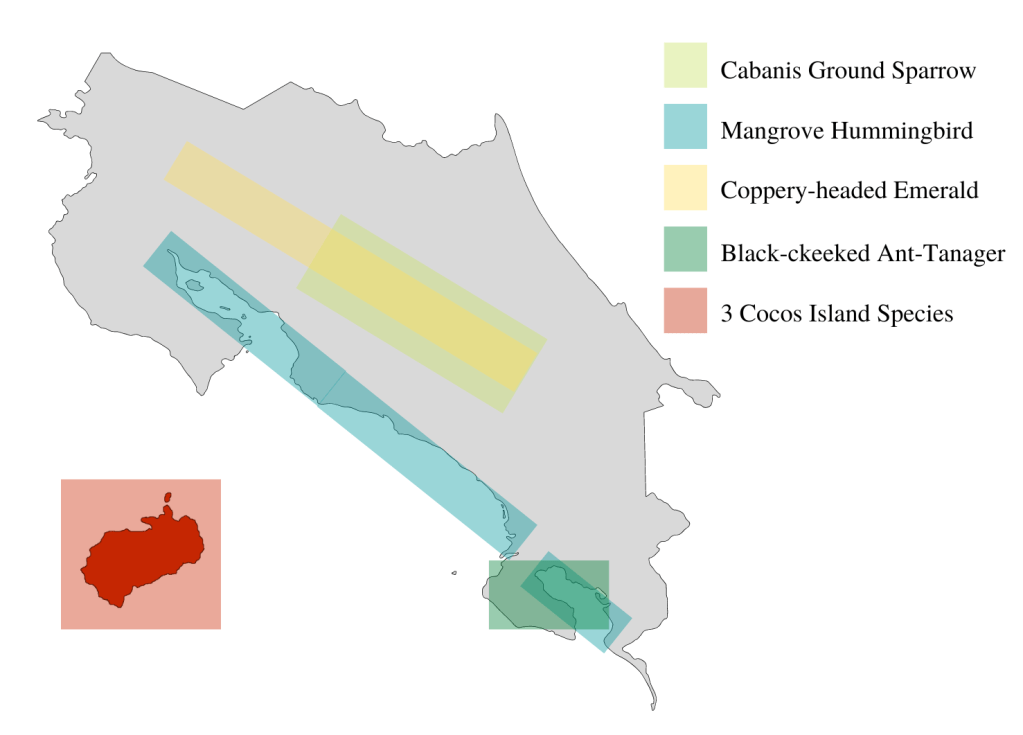 A este tipo de aves con una distribución restringida a una eco región geográfica claramente determinada se les conoce como especies endémicas¹. Este término puede interpretarse a diferentes escalas, en la que podemos hablar de un endemismo a nivel regional (e.g. América Central), delimitarlo al territorio político de un país (e.g. Costa Rica) o especificar una localidad aún más pequeña (e.g. Isla del Coco).