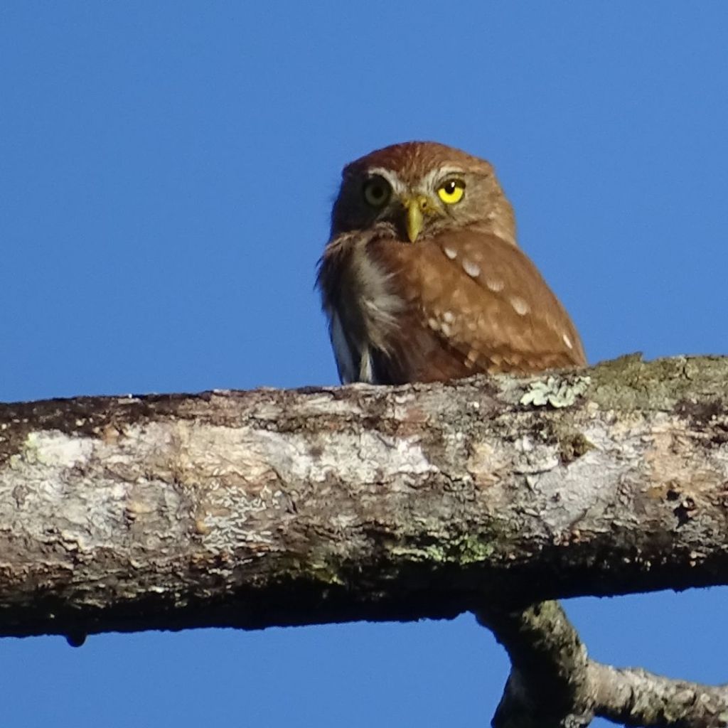 Teniendo clara la misión y con una motivación al máximo, comenzamos desde la madrugada a documentar todas las aves que detectáramos del entorno. Al inicio, se volvió más un ejercicio de escuchar e identificar sonidos. No obstante, en uno de los primeros árboles que revisamos, nos encontramos con un hermoso mochuelo común, también conocido como majafierro (Ferruginous Pygmy-Owl). Un búho con hábitos principalmente diurnos, que custodiaba el arranque de nuestra aventura.