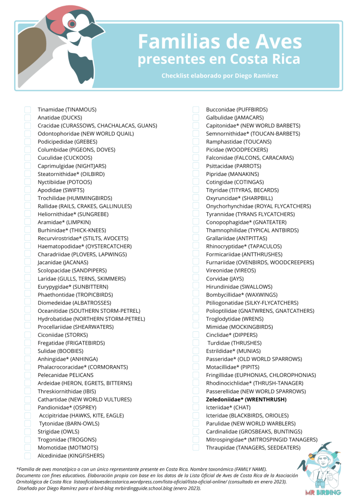 Existen diferentes recursos que podemos utilizar para sumergirnos un poco más en este tema, como lo son el proyecto Bird Families of the World (sitio en el que me inspiré para traerles esta recomendación) y el segmento educativo de la página web de la Asociación Ornitológica de Costa Rica. Asimismo, les comparto una lista de verificación sobre las familias de aves presentes en Costa Rica, un documento imprimible en el que pueden llevar nota de sus registros (descargar).