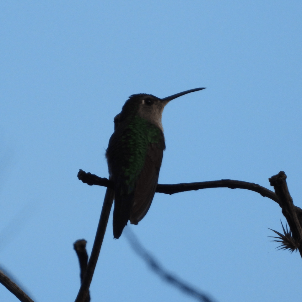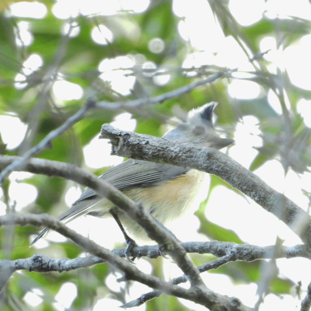 Para el día siguiente (Día 6), se unió a nuestro equipo pajarero Joshua Saavedra para visitar el Municipio de Emiliano Zapata. La mañana la dedicamos al Cerro de Tepeapulco, un paisaje cálido con áreas abiertas y un interesante bosque de selva baja. Este nos permitió observar al colibrí berilo (Berylline Hummingbird) y al chipe gorra canela (Rufous-capped Warbler). Íbamos subiendo la montaña cuando nos topamos con un gran grupo de aves forrajeando en la zona, entre las cuales se encontraba el carbonero cresta negra (Black-crested Titmouse). Este herrerillo, fácilmente localizable dentro de la bandada por su tamaño, me cautivó por su forma tan singular y su divertido “copete”, siendo una de mis aves favoritas del viaje.